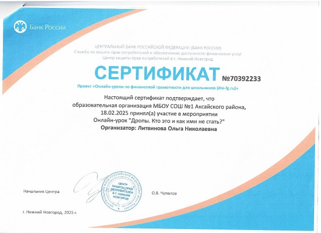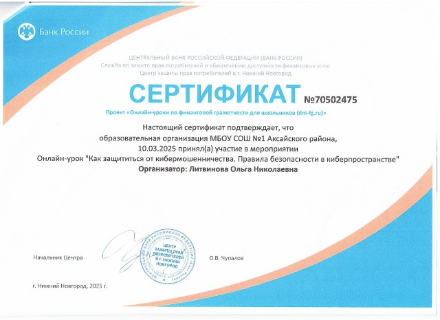 Организатором проекта выступает Центральный банк Российской Федерации. Проект "Онлайн-уроки финансовой грамотности" помогает старшеклассникам из любой точки России получить равный доступ к финансовым знаниям, предоставляет возможность «живого» общения с профессионалами финансового рынка, способствует формированию принципов ответственного и грамотного подхода к принятию финансовых решений. Эксперты рассказывают школьникам о личном финансовом планировании, инвестировании, страховании, преимуществах использования банковских карт. Особое внимание уделяется правилам безопасности на финансовом рынке и защите прав потребителей финансовых услуг.