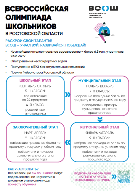 Всероссийская олимпиада школьников проводится ежегодно по 24 предметам с 1 сентября по 30 июня. Она включает четыре этапа: школьный, муниципальный, региональный и заключительный. Дипломы победителей и призеров заключительного этапа состязания, действующие четыре года, дают право поступления в ведущие вузы России без экзаменов по соответствующему профилю. Ответы на часто задаваемые вопросы размещены на сайте олимпиады.