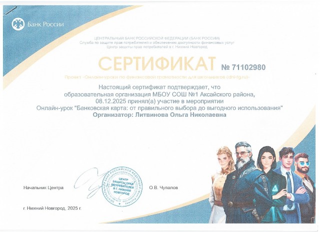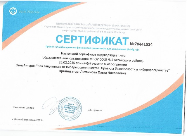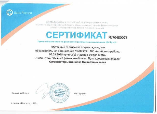 Организатором проекта выступает Центральный банк Российской Федерации. Проект "Онлайн-уроки финансовой грамотности" помогает старшеклассникам из любой точки России получить равный доступ к финансовым знаниям, предоставляет возможность «живого» общения с профессионалами финансового рынка, способствует формированию принципов ответственного и грамотного подхода к принятию финансовых решений. Эксперты рассказывают школьникам о личном финансовом планировании, инвестировании, страховании, преимуществах использования банковских карт. Особое внимание уделяется правилам безопасности на финансовом рынке и защите прав потребителей финансовых услуг.